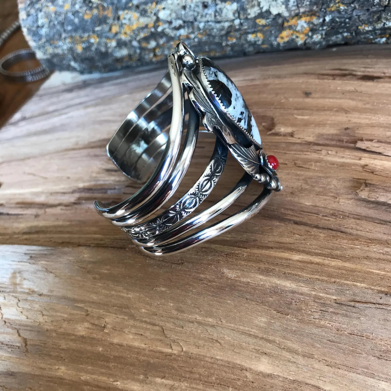 White Buffalo Turquoise Bracelet with Rosarita wildflowers~ Sterling Silver Cuff Bracelet Southwestern Style~ Artisan Handmade (5125)