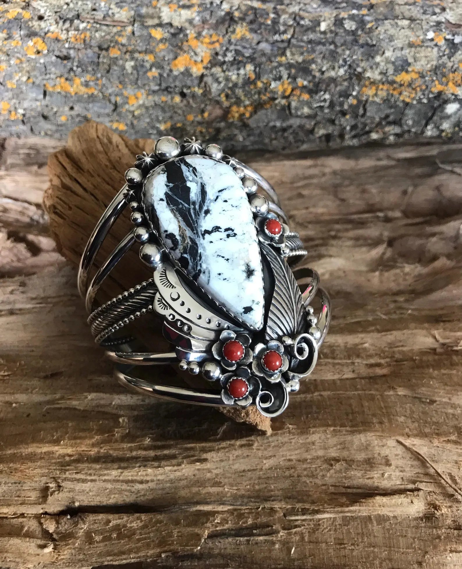 Fantastic White Buffalo Turquoise Sterling Cuff bracelet, with red coral wildflowers.